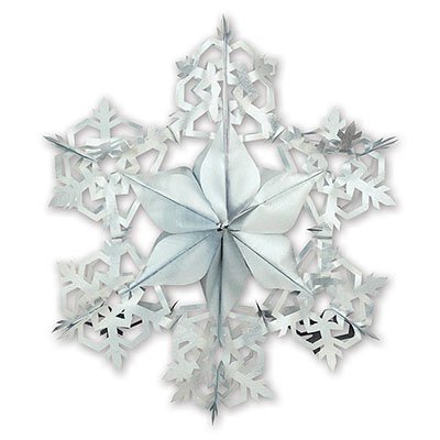 Новогоднее декоративное украшение из фольги в форме объемной снежинки серебряного цвета. Размер изделия 60х60х14 см.